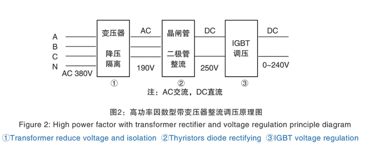 1. ਵੋਲਟੇਜ ਰੈਗੂਲੇਸ਼ਨ ਨੂੰ ਸੁਧਾਰ ਕੇ ਵਰਗੀਕ੍ਰਿਤ: ਥਾਈਰਿਸਟਰਸ (ਐਸਸੀਆਰ) ਦੀ ਵਰਤੋਂ ਸਮਕਾਲੀ ਸੁਧਾਰ ਅਤੇ ਵੋਲਟੇਜ ਰੈਗੂਲੇਸ਼ਨ ਨੂੰ ਪੂਰਾ ਕਰਨ ਲਈ ਕੀਤੀ ਜਾ ਸਕਦੀ ਹੈ, ਜਾਂ ਪਹਿਲਾਂ ਡਾਇਓਡ ਜਾਂ ਥਾਈਰਿਸਟਰਸ ਰੀਕਟੀਫਾਇੰਗ ਦੀ ਵਰਤੋਂ ਕਰੋ ਅਤੇ ਫਿਰ ਆਈਜੀਬੀਟੀ ਰੈਗੂਲੇਟ ਵੋਲਟੇਜ ਦੀ ਵਰਤੋਂ ਕਰੋ। IGBT ਰੈਗੂਲੇਟ ਵੋਲਟੇਜ ਦੀ ਵਰਤੋਂ ਸਾਜ਼ੋ-ਸਾਮਾਨ ਦੇ ਫੈਕਟਰ ਨੂੰ ਬਿਹਤਰ ਬਣਾਉਣ ਲਈ ਹੈ। ਬਿਜਲੀ ਦੀ ਬਚਤ ਕਰ ਸਕਦਾ ਹੈ ਅਤੇ ਵੈਲਡਿੰਗ ਦੀ ਗੁਣਵੱਤਾ ਨੂੰ ਹੋਰ ਸੁਧਾਰ ਸਕਦਾ ਹੈ।